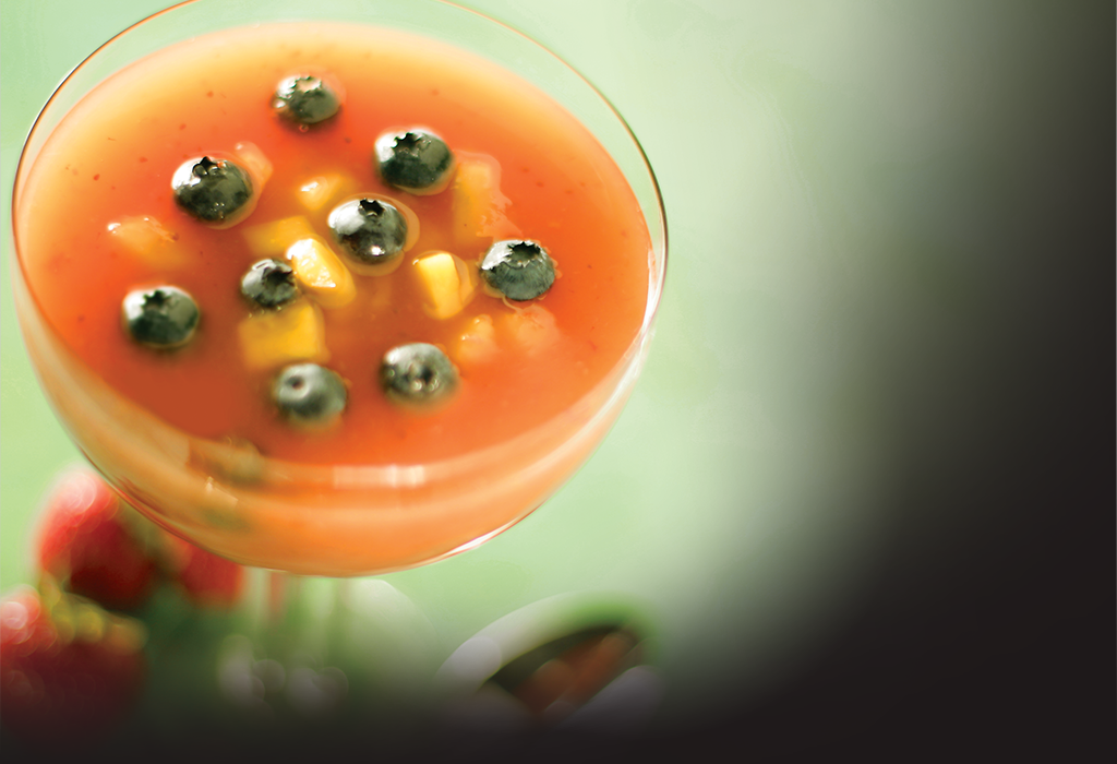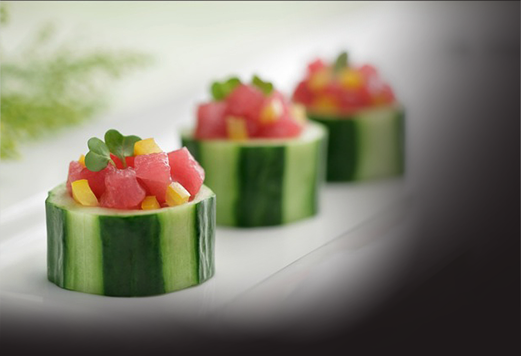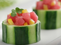 served in a Cucumber Cupwith Yellow Bell Peppersand Micro Greens