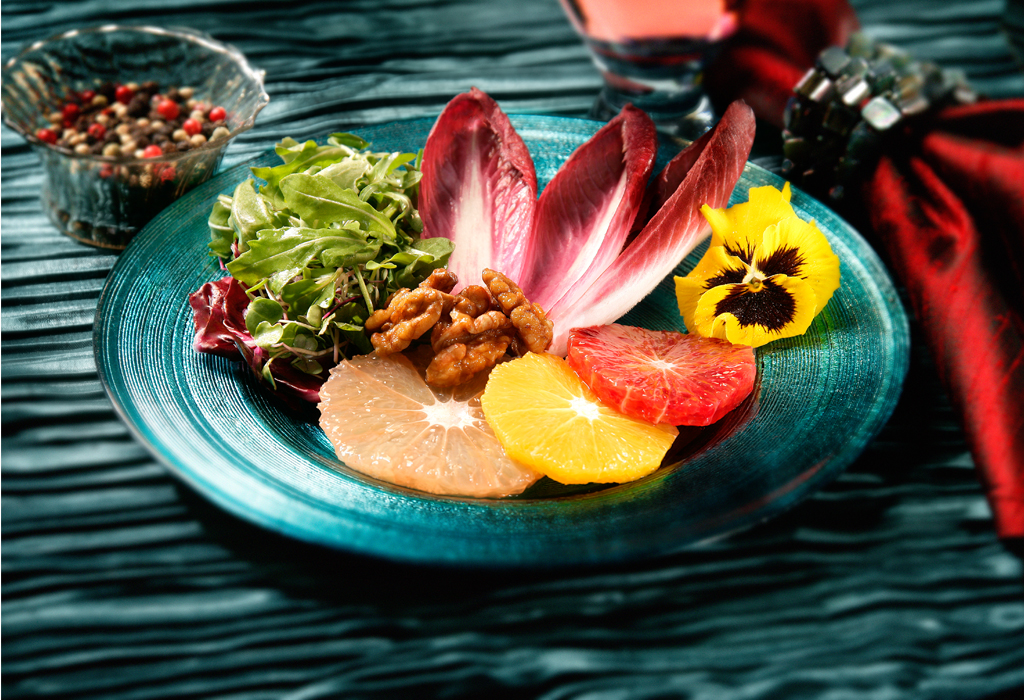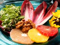 with Red Belgium Endive, Micro Greens and candied Walnuts, Raspberry Vinaigrette