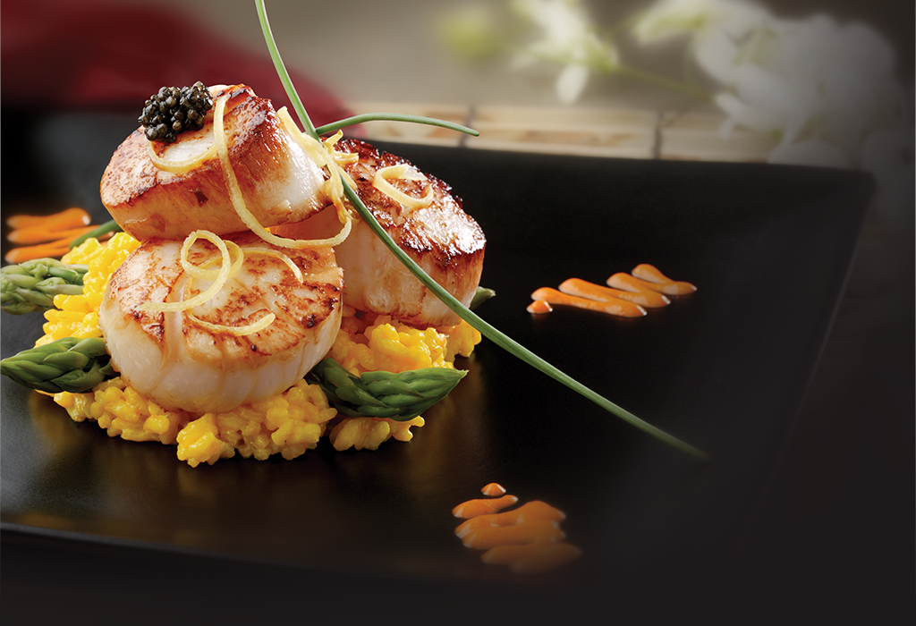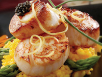 with Lemon Saffron Asparagus Risottowith roasted Red Pepper Coulis garnished with Hackleback Caviarand candied Lemon Zest